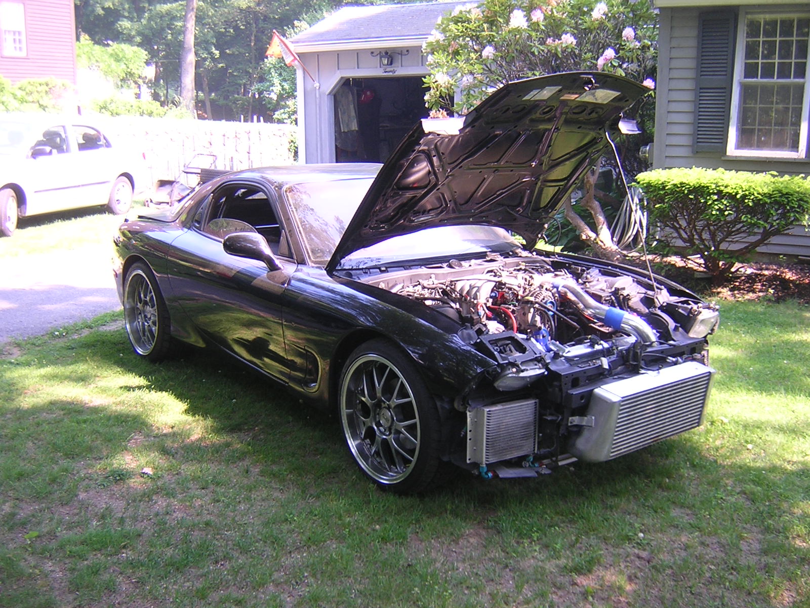 here it is, two rotor with street port, has a T-70 turbonectics single turbo, the whole front nose is intercooler, with 8 QT oil pan and dual oil coolers, with stoptech big brakes.