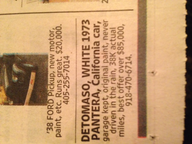 I don't know about the Pantera but I sure like that 38 Ford Pick up for $20,000. Imagine it was not too many years ago folks were giving these away for next to nothing. But then I am now older then dirt so $85,000 also gets you a NEW pickup with everything but the Brazilian Girls.