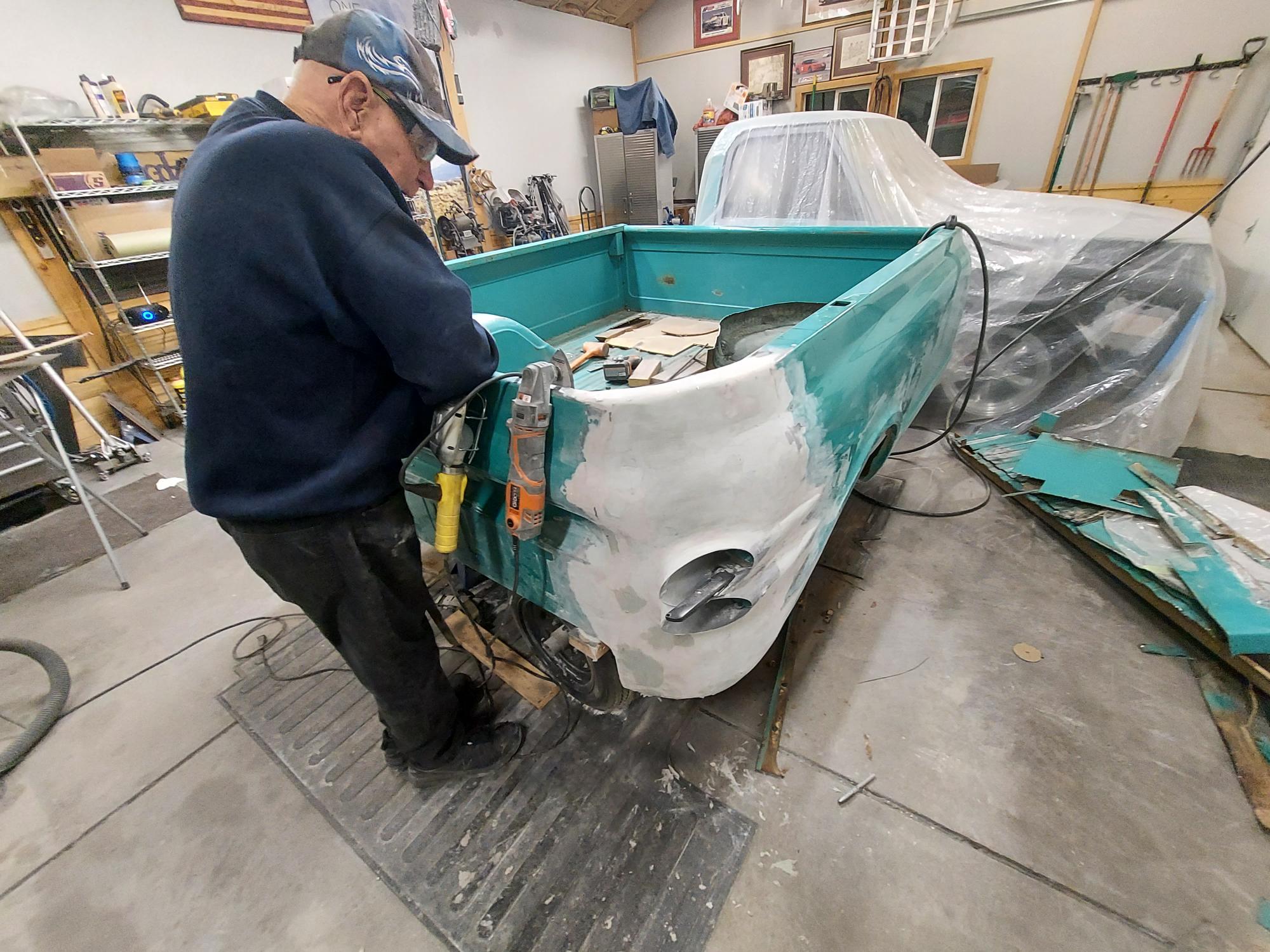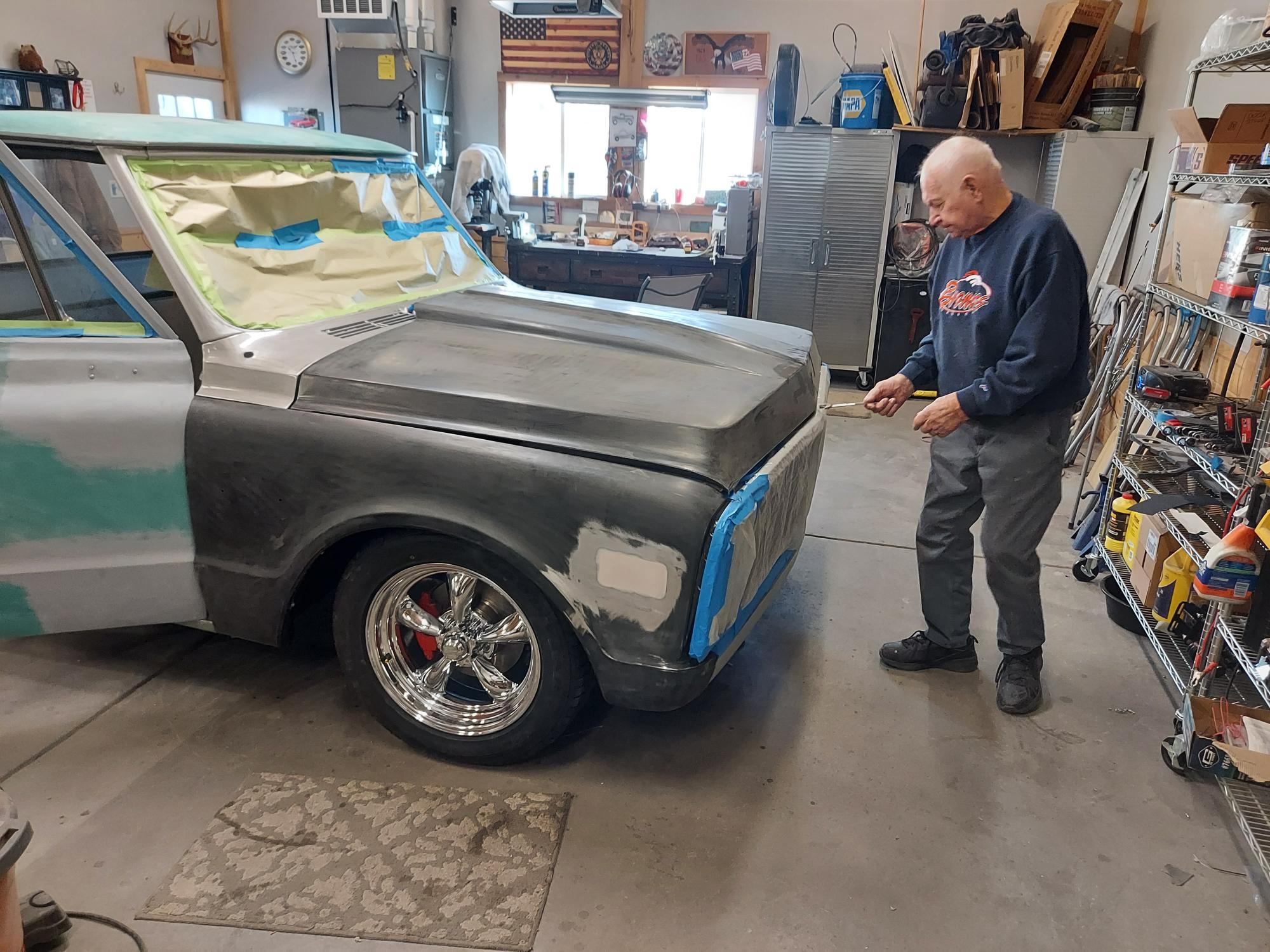 Ernie, (91 yr old Father in law) STARTED a hot rod job 9 months ago!!! A complete '69 Chevy C-10. Stripped to frame in 3 wks, whole new frt end, disc brks, rebuilt engine, etc, etc, etc....now ready for paint!!