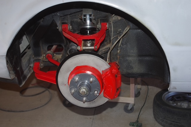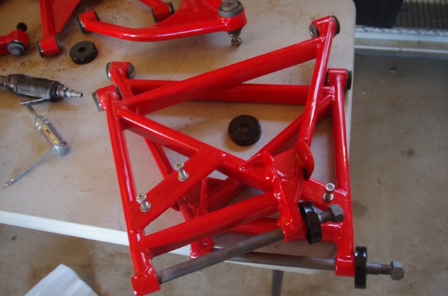 > Front suspension is completed with all parts powdercoated--new bushings,ball joints,shocks,steering rack and rebuilt brakes. rear suspension is waiting for the uprights coming back from powdercoater next week.Passengers compartment is done with doorpanel,kickpanel and console done in black leather.New carpet installed.Seats done in black leather.Engine had several test runs and is sounding great. First test drive anticipated in next 2 weeks.