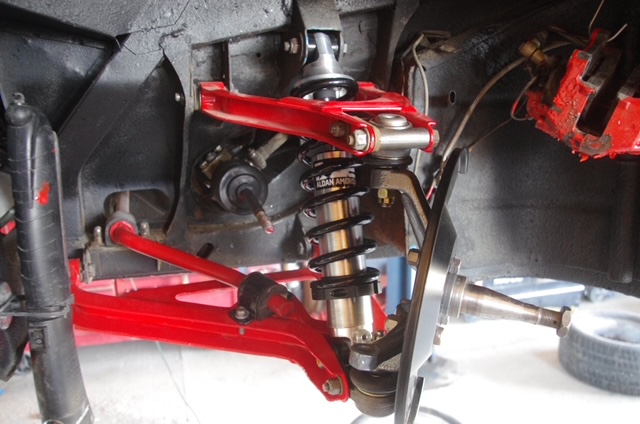 >>>> Front suspension is completed with all parts powdercoated--new bushings,ball joints,shocks,steering rack and rebuilt brakes. rear suspension is waiting for the uprights coming back from powdercoater next week.Passengers compartment is done with doorpanel,kickpanel and console done in black leather.New carpet installed.Seats done in black leather.Engine had several test runs and is sounding great. First test drive anticipated in next 2 weeks.