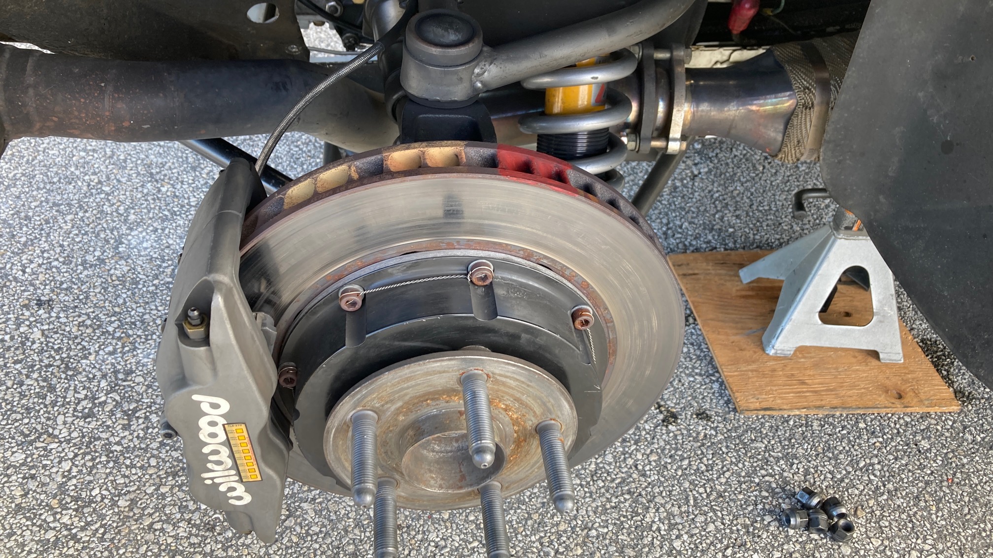 Brake temperature paint; apply then run the race. The mustard color is what we’re shooting for. The red indicates not enough temp in the brakes compared to the front. That means the rears aren’t applying as much as the fronts, do we make a bias adjustment.
